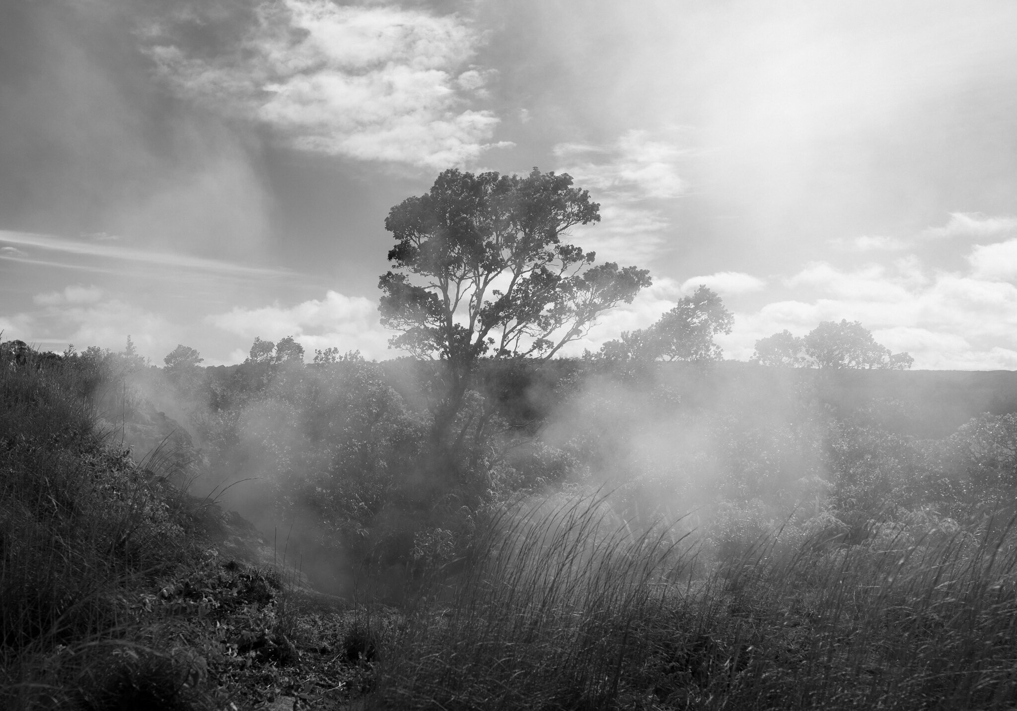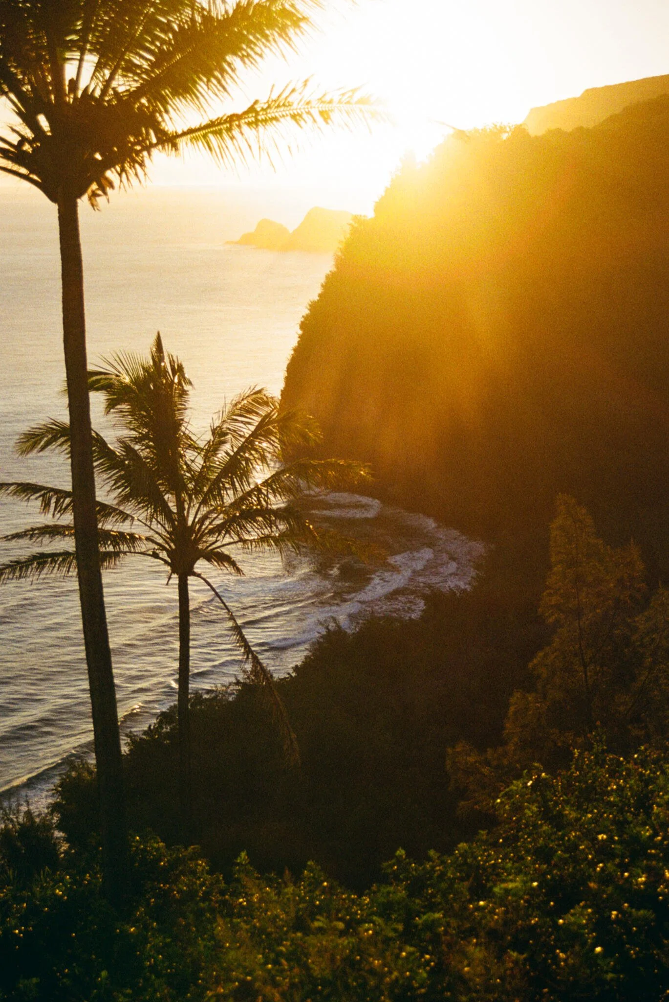 Sunset on the same day, at the west coast of Big Island. The sun created incredibly tangible rays as it filtered through the trees. I waited for the moment when the calm water collected enough power to send up a splash against the rocky shore.