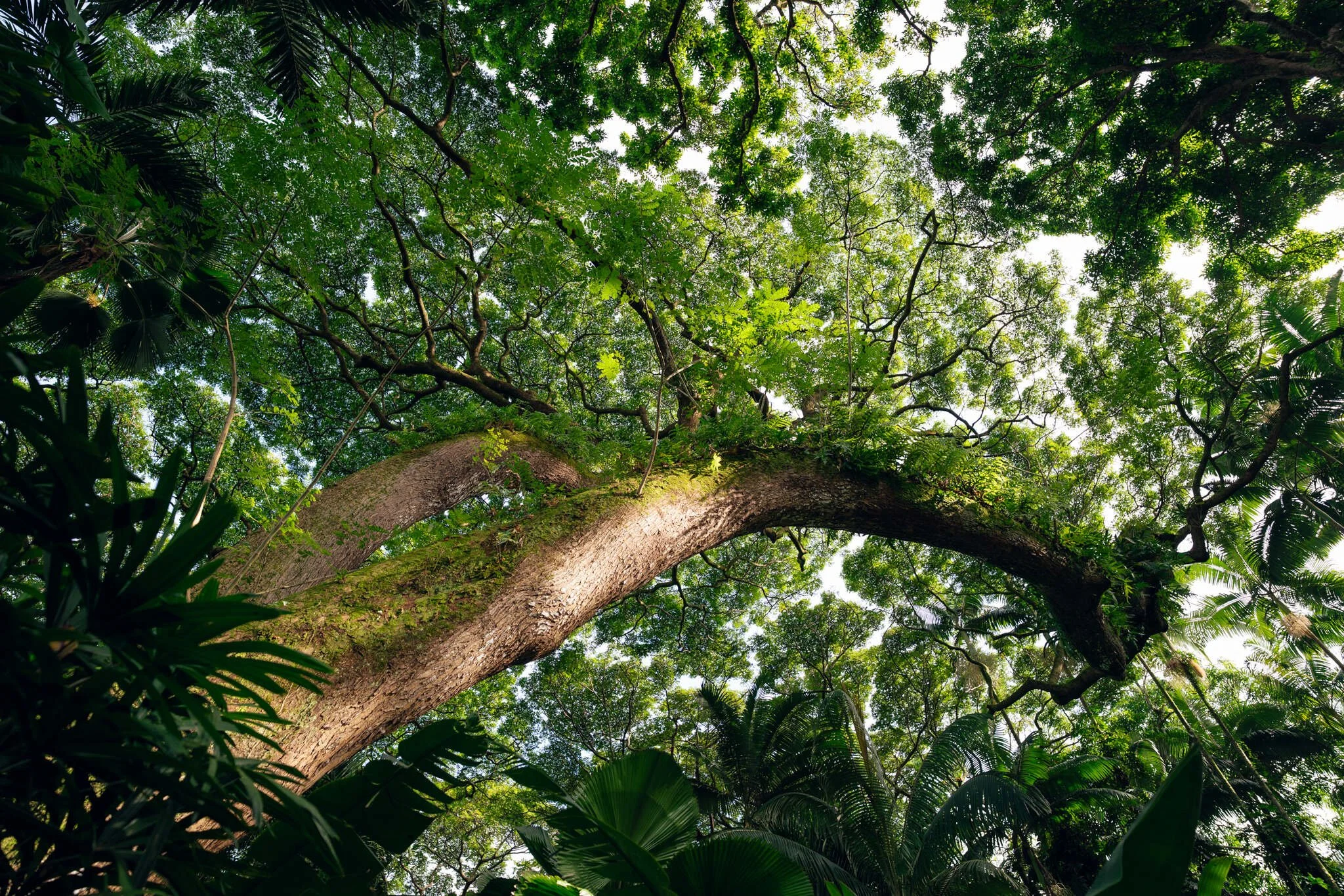 The tropical rainforest biome, located on the windward, Hilo side of the island. Here, a bioreserve is built into a rainforest gulch that opens into the ocean. Dense canopy trees and giant ferns fight for every inch of sunlight. Tall Hāpuʻu tree ferns support mini ecosystems, germinating air plants and seedlings in their spongy trunks. Moss covers everything, soaking in the humidity and mist. The smell is dense, earthy, and floral.