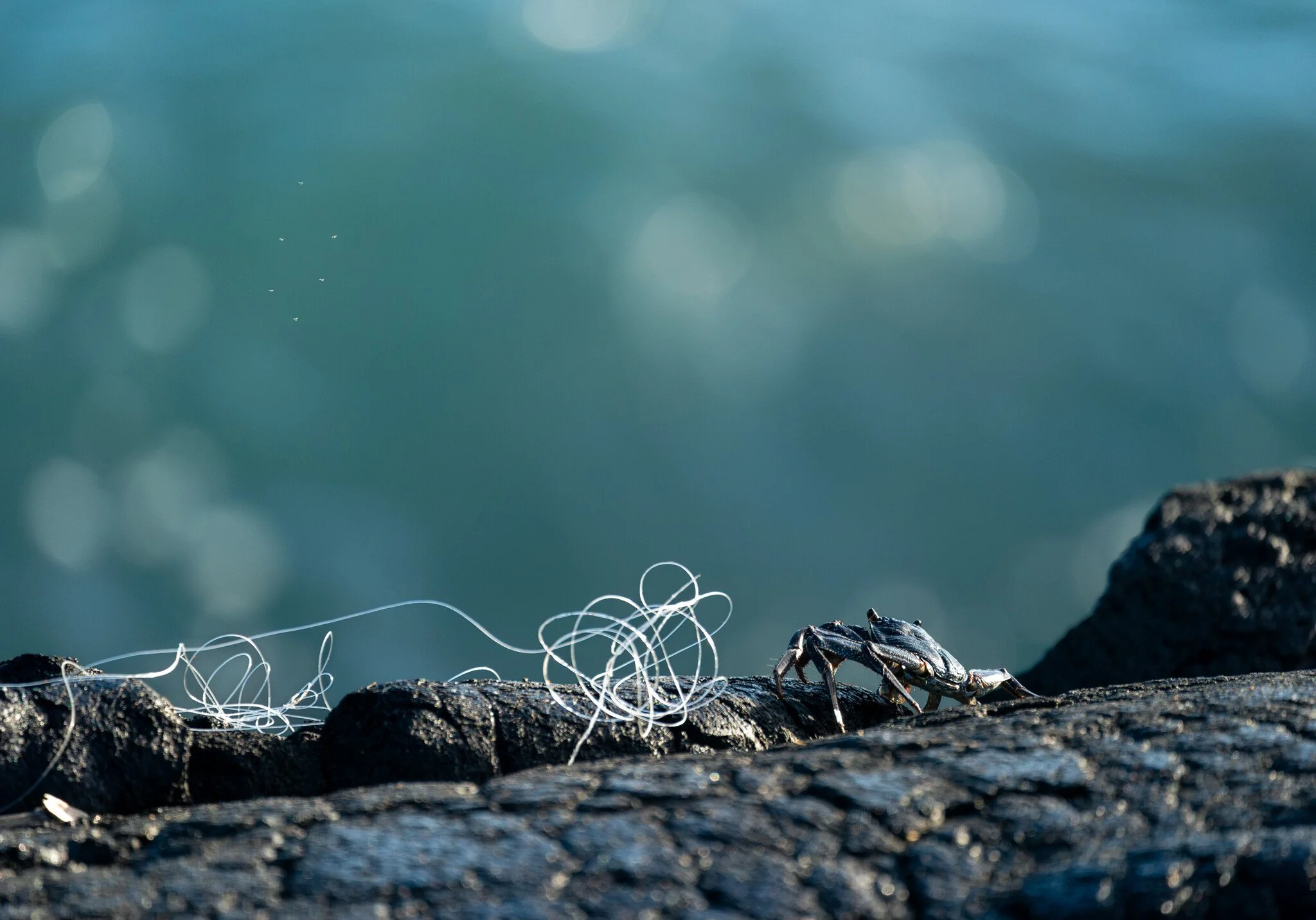 Hawaiian locals often cast long lines to fish at the coast. Some leave behind their cut fishing lines, which the crabs must navigate as they wait for food.