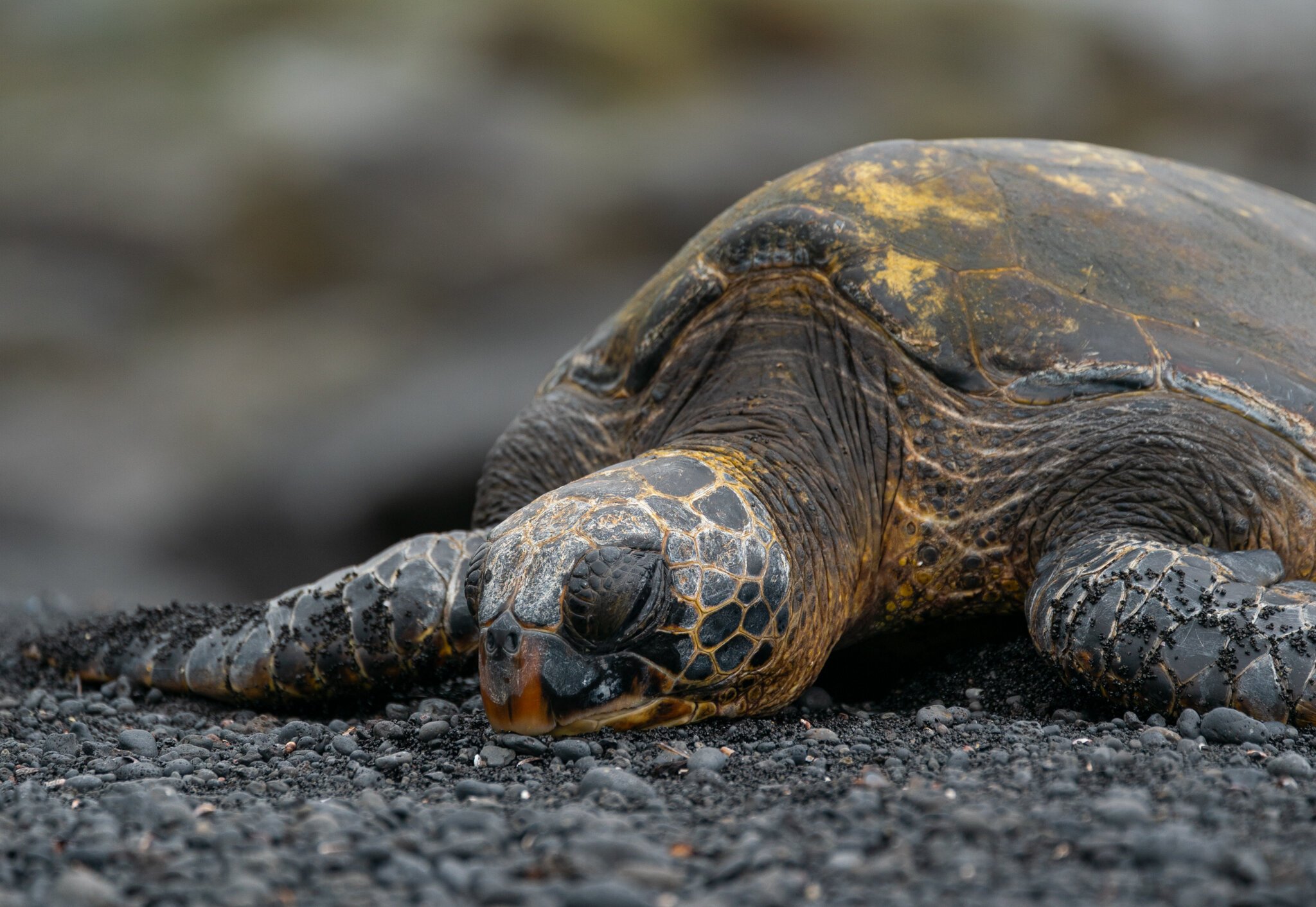 The Hawaiian Green Sea Turtle. Previously critically endangered with only 37 left, conservation efforts and huge fines (USD $50,000 for touching one) have brought the population back to 4000 nesting females. This one has hauled out to bask on the beach. It napped almost the entire time I was there, stopping only to yawn.