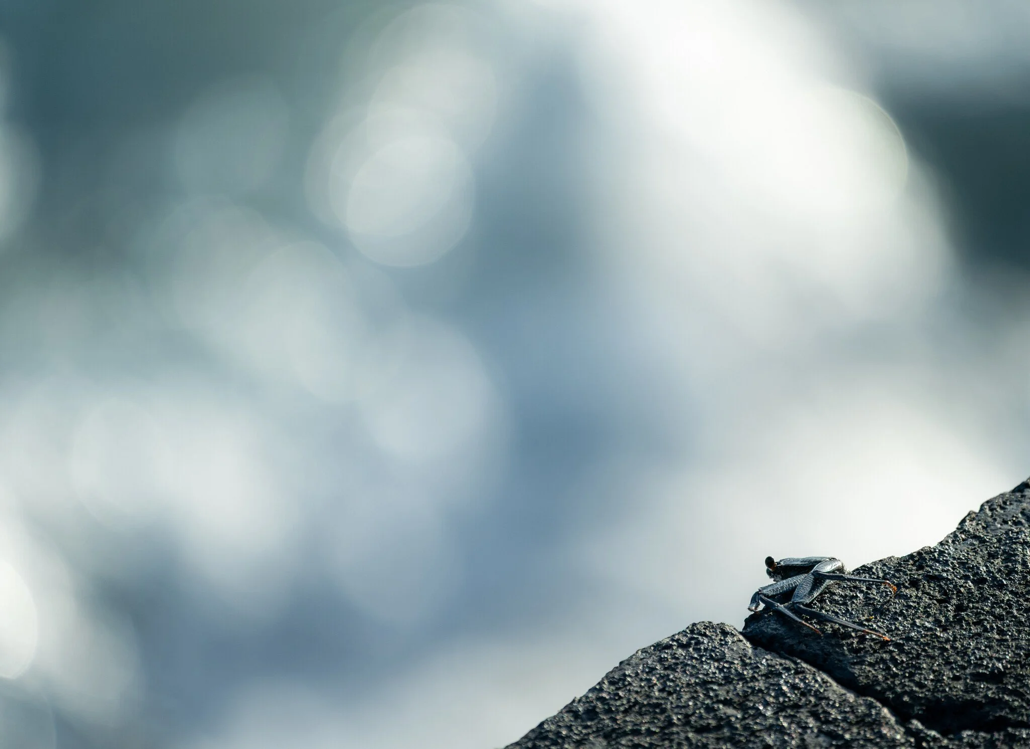 The A'ama Crab camouflages so well with the black shoreline they're near impossible to spot from even a few feet away. They sit immobile, waiting for the next wave to bring algae and small animals to feed on. Catching them on the camera is a game of patience; the smallest movement or shadow sends them darting into crevasses at insane speeds.