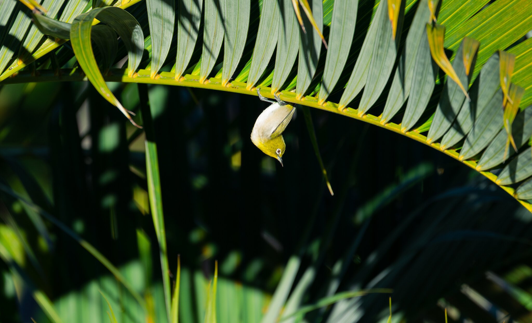 The Japanese White-Eye. Their gender is almost indiscernible from plumage. This particular one was flitting about a palm tree in Kona, not too far from the coast.