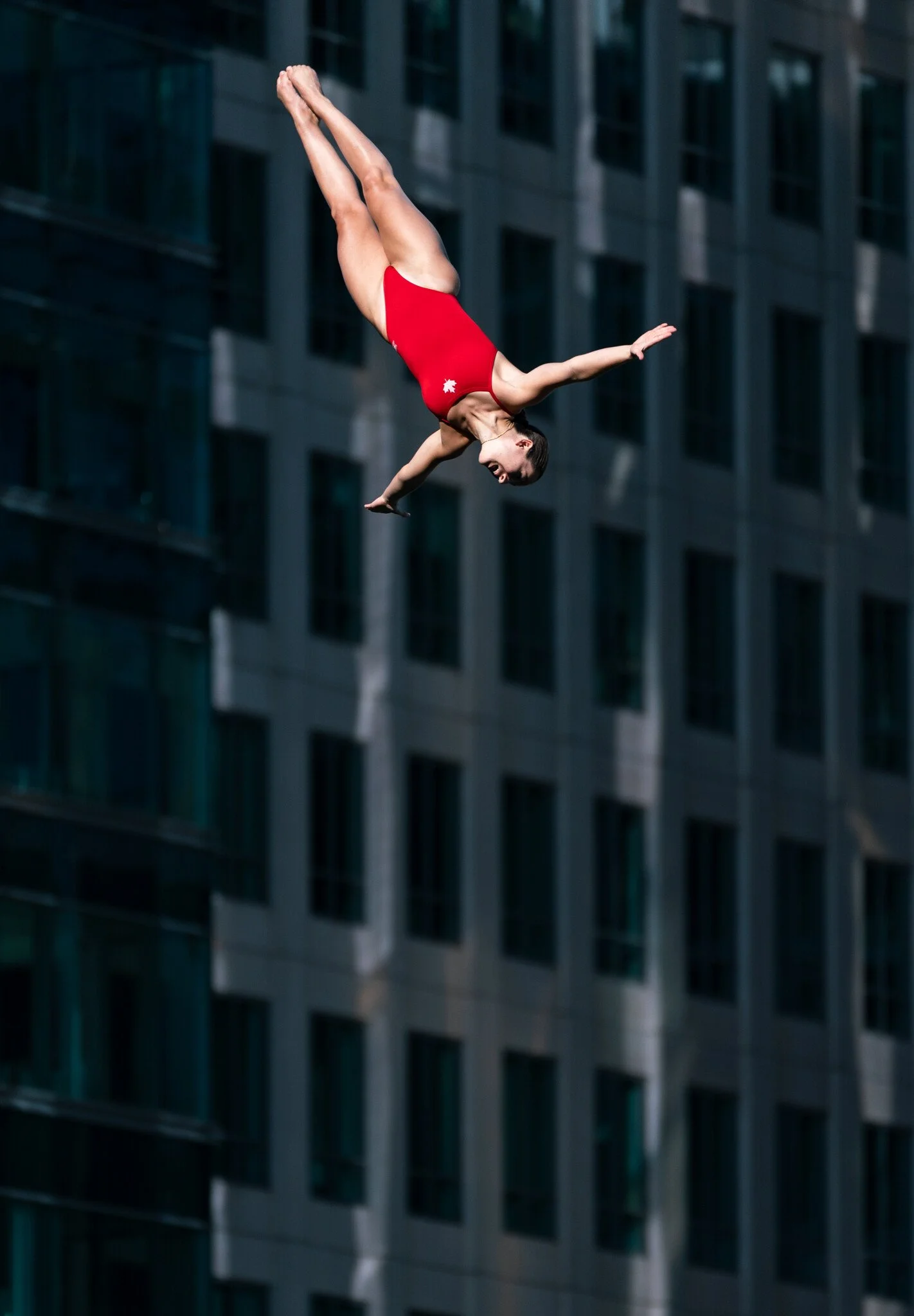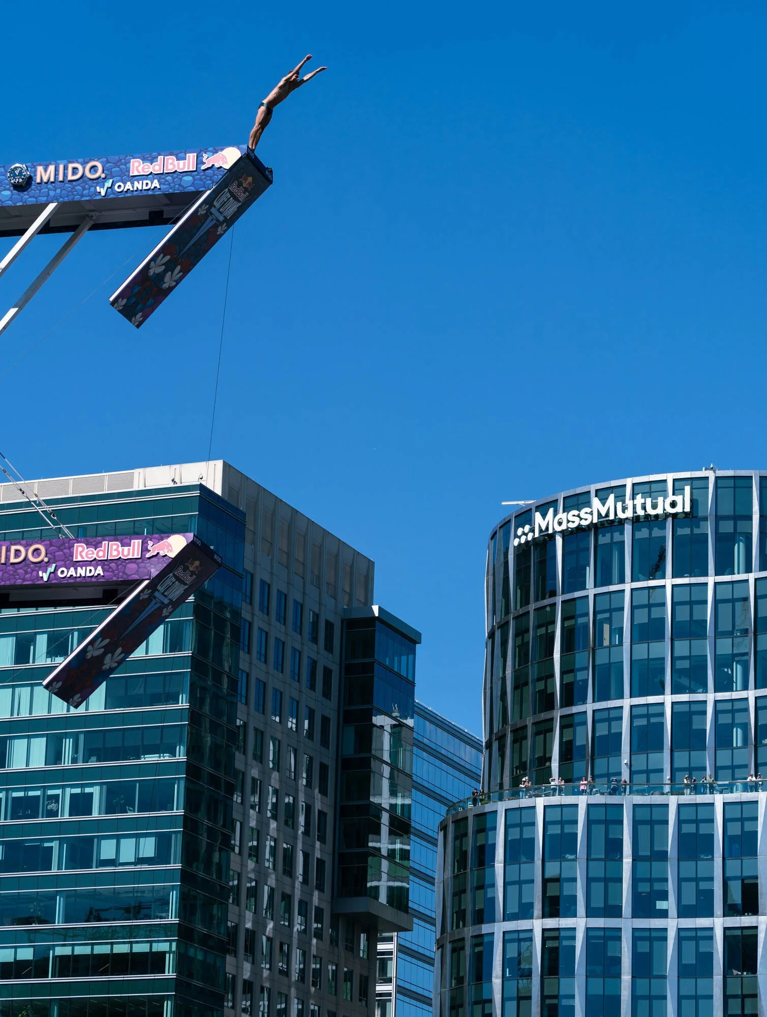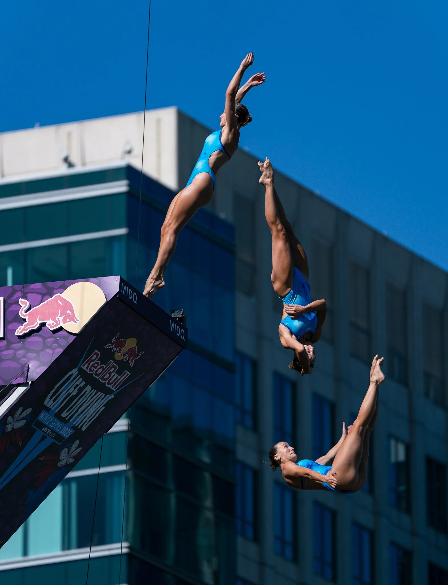 Cliff Diving World Series Final 2025, Boston. World-class diving from the roof of the Institute of Contemporary Art into the Boston Harbor. Above: Women’s fourth round dive.