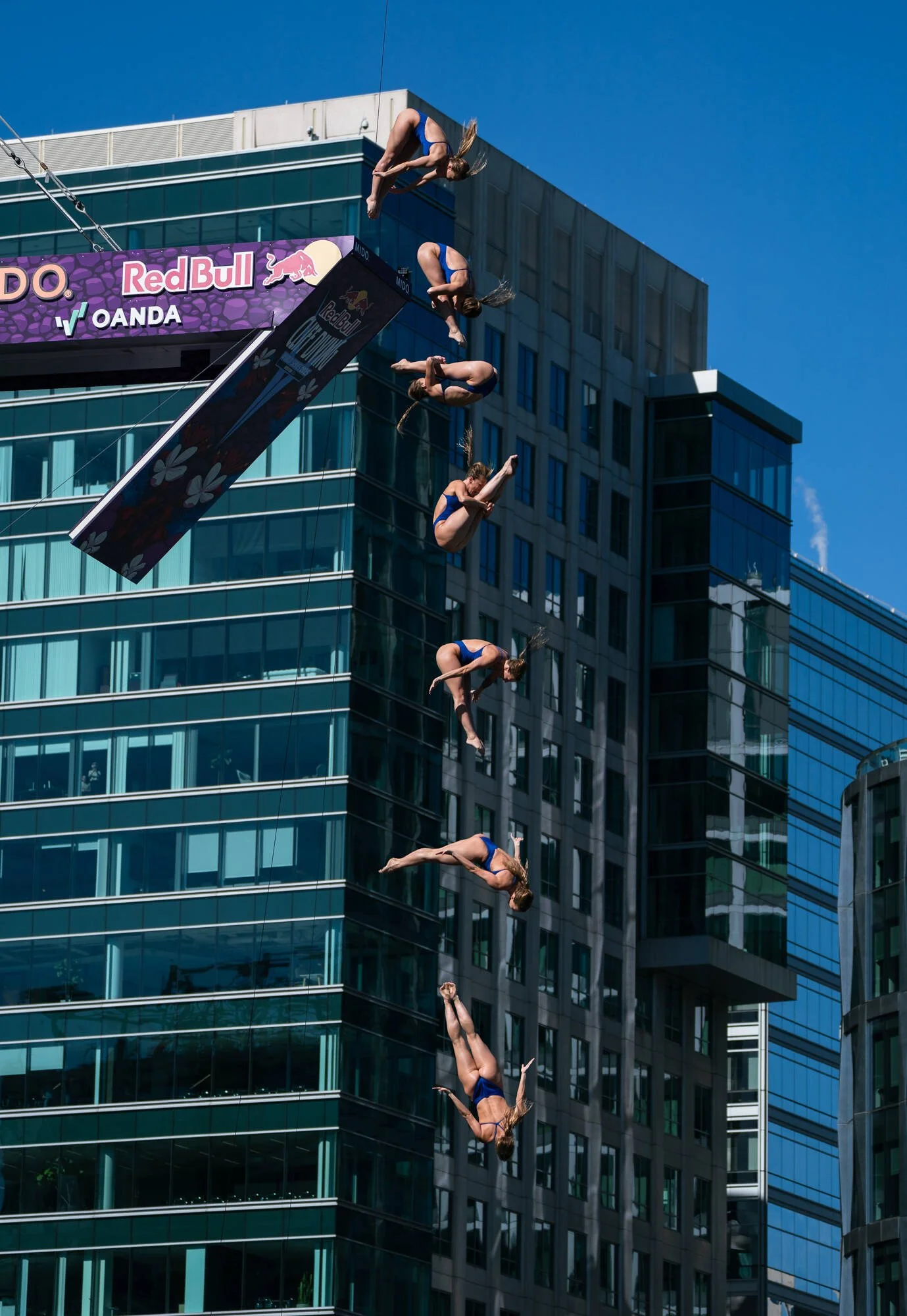Then the competition kicks into full flow. In Red Bull fashion, announcers and DJs keep the energy wired as divers hurl themselves off the building. Judges hold up their scores and the athletes overtake each other on the scoreboard, the crowd roaring in response. They compete through three rounds before the winner is crowned on the podium and champagne bottles sprayed.
